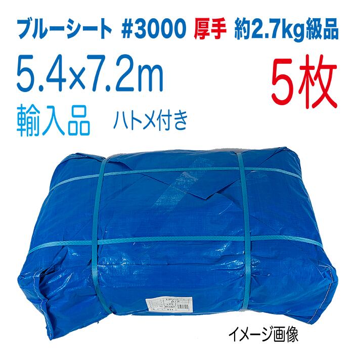 (個人宅は別途送料)輸入ブルーシート 厚手 #3000 5.4×7.2m 5枚セット ハトメ加工あり san-ai 約2.7kg級品 3000番手 豪雨・台風・水害対策 防災 レジャー、アウトドア、野積カバー用、雨から守る積荷カバー用に