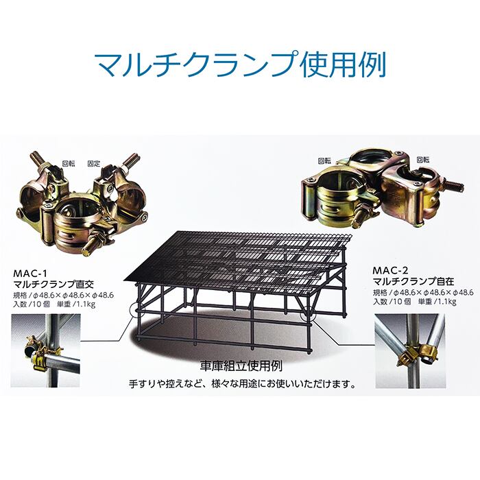 マルチクランプ 自在 Φ48.6×Φ48.6 10個セット MAC-2 車庫組み立て,小屋掛け,手すり,控え,などに使える特殊形状,3連クランプ,mls 個人宅配送不可