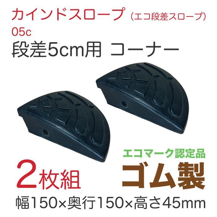 カインドスロープ エコ段差ゴムスロープ 段差5cm用 コーナー用 2枚組 05c kaizu H45×D150×W150mm。黒色(0.4kg) 接続ボルト付 本体の重量に加え、連結により強固に固定 高品質ゴムのリサイクル エコマーク認定製品 環境配慮 自転車 介護 車椅子 ベビーカー シルバーカー