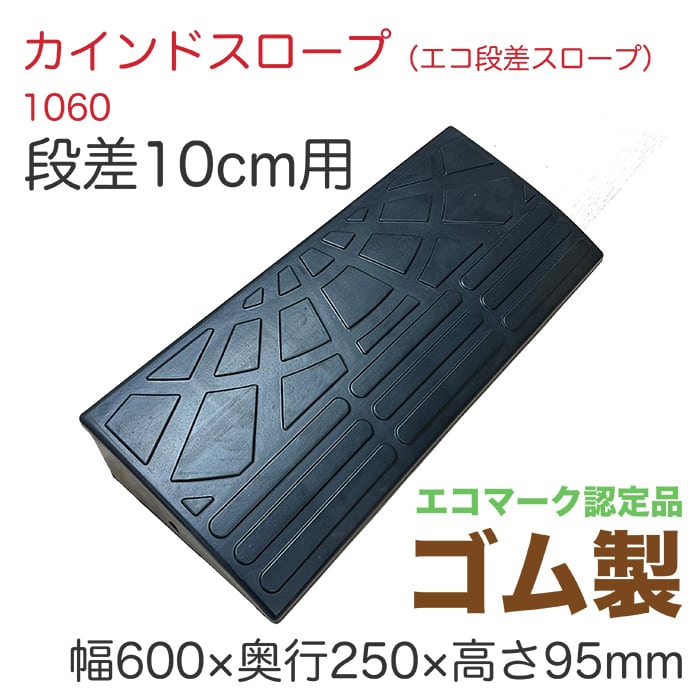 カインドスロープ エコ段差ゴムスロープ 段差10cm用 1060本体 kaizu 1枚 H95×D250×W600mm。黒色(4.0kg) 接続ボルト付 本体の重量に加え、連結により強固に固定 高品質ゴムのリサイクル エコマーク認定製品 環境配慮 自転車 介護 車椅子 ベビーカー シルバーカー