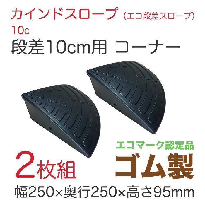 カインドスロープ エコ段差ゴムスロープ 段差10cm用 コーナー用 2枚組 10c kaizu H95×D250×W250mm。黒色(1.2kg) 接続ボルト付 本体の重量に加え、連結により強固に固定 高品質ゴムのリサイクル エコマーク認定製品 環境配慮 自転車 介護 車椅子 ベビーカー シルバーカー
