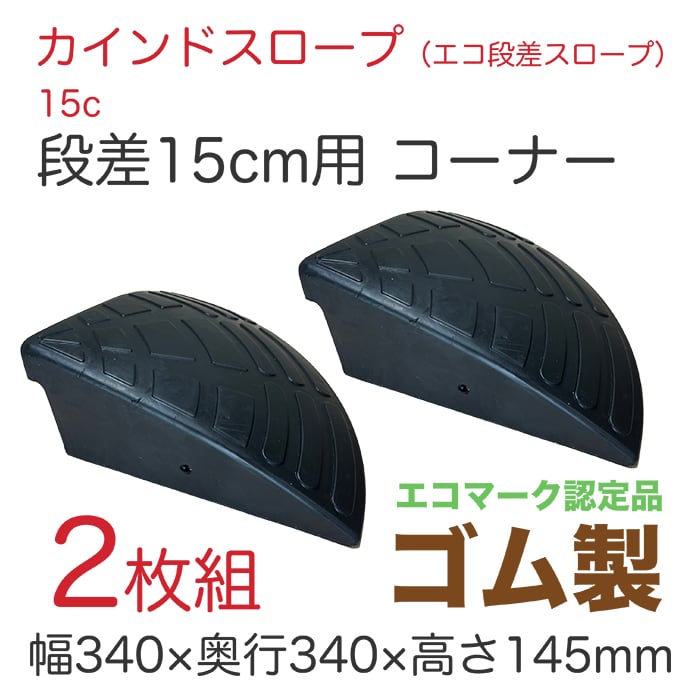 カインドスロープ エコ段差ゴムスロープ 段差15cm用 コーナー用 2枚組 15c kaizu H145×D340×W340mm。黒色(3.0kg) 接続ボルト付 本体の重量に加え、連結により強固に固定 高品質ゴムのリサイクル エコマーク認定製品 環境配慮 自転車 介護 車椅子 ベビーカー シルバーカー
