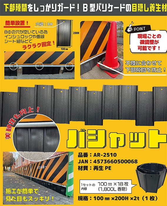 バシャット 2セット(3.6m分) AR-2510 B型バリケード下部隙間の目隠し養生材 18枚連結×2セット=36枚 AR2510 ガードフェンスの下部隙間をガード