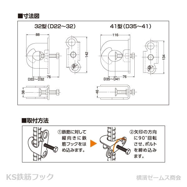 KS 鉄筋フック 32型 20個セット 適応鉄筋径:D22~32 軽量1個あたり0.63kg 有色クロメート(金色)柱・梁筋から親鋼ロープを取る為の墜落災害防止用金物(国元商会)クニモト 1822100 (個人宅配送不可)任意の高さでガッチリと取元が設置可能!