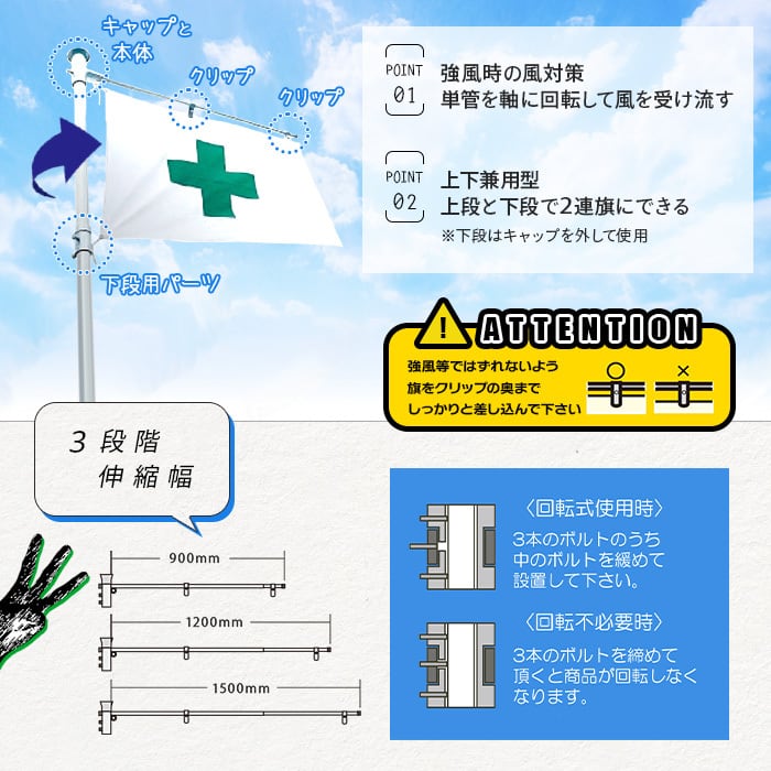 ※強風等ではずれないよう、旗をクリップの奥までしっかりと差込んでご使用ください。