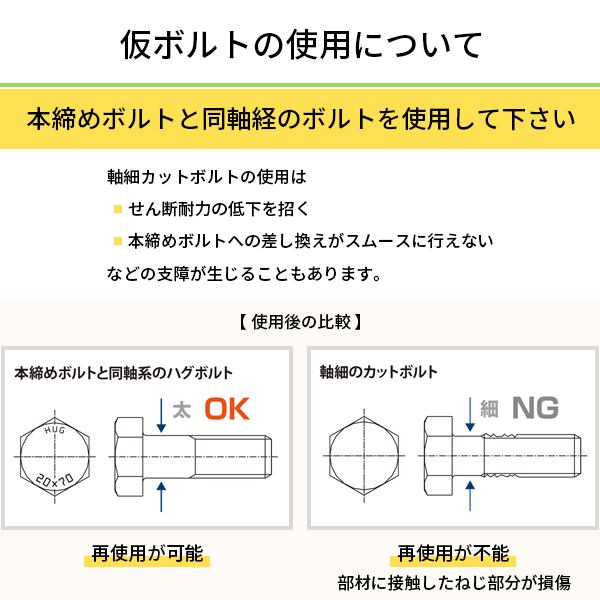 仮ボルトは必ず本締めボルトと同軸経のボルトを使用して下さい。