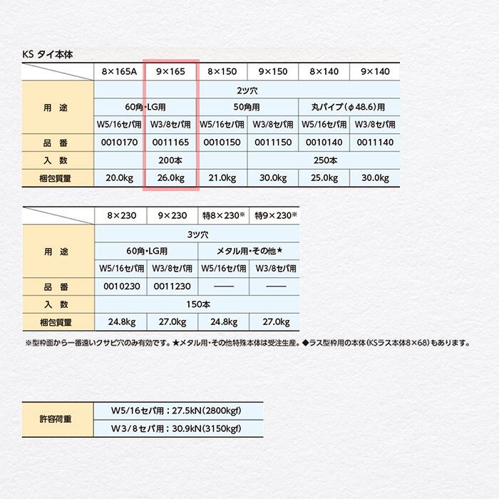 KS タイ本体 クサビ式 2ツ穴 9×165 角LG用 60角・LG用 W3/8セパ用 200本 国元商会 クニモト 0011165 kms