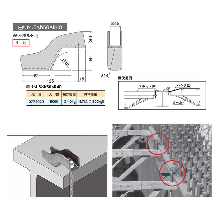 KS 床版用吊ピース 曲り t4.5×h50×R40 50個 0775029 W1/2ボルト用 国元商会 kms ビーム吊り下げ用溶接金物