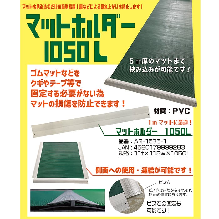 マットホルダー 1050 L (エル) 1本 幅115mm×長さ1050mm 厚み11mm AR-1536-1, AR1536-1 歩行者マット自体への釘打ちやテープ貼付けがいらないことで、歩行者マットの損傷を防止 風等による捲れ上がりを防止 アラオ 5mm厚までのマットに使用できます 旧AR-1511は廃盤